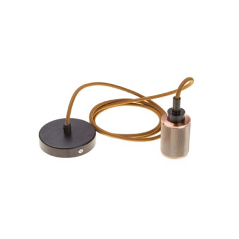 PENDENTE ASSEMBLATO 2M, PORTALAMPADA MODERNO E27 IN METALLO COLORE BRONZO LUCIDO, ROSONE NERO Ø 100MM H 35MM, CAVO TONDO 3X0,75